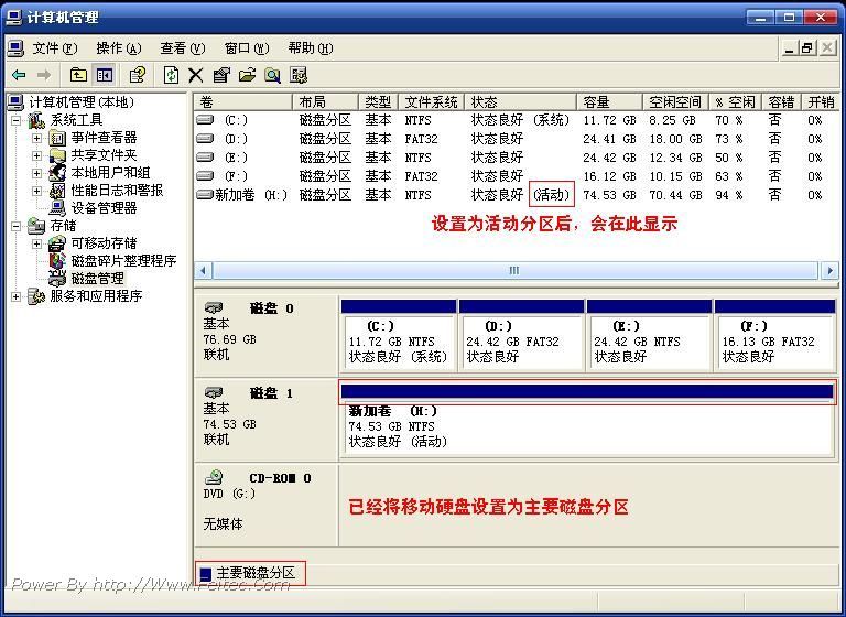 (1)、右键点击“我的电脑”—“管理”—“磁盘管理”(见图1)定位到移动硬盘,确认分区为“主要磁盘分区”(一般为移动硬盘的第一个分区),并可引导。